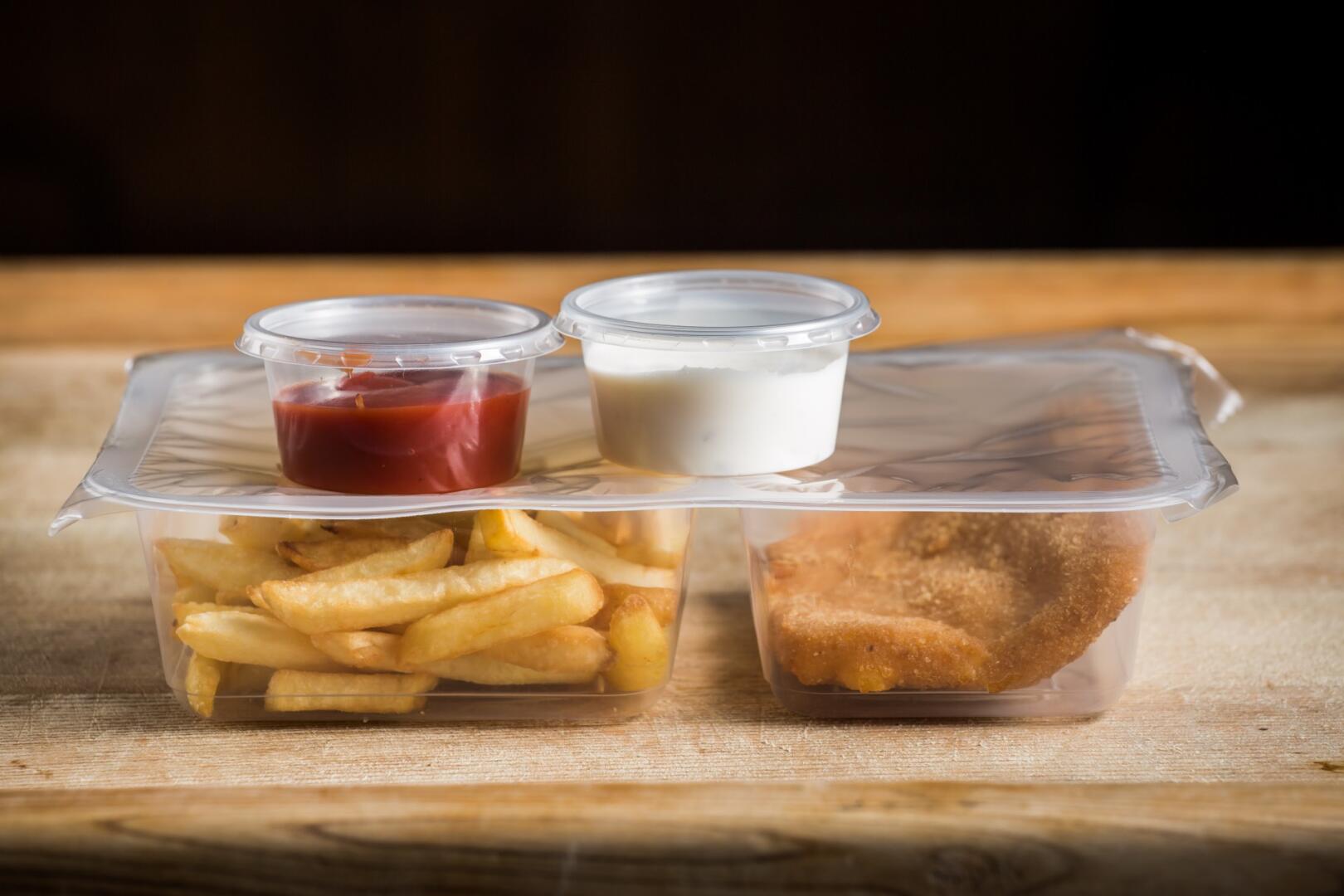 130/180g. kuracie prsia, kečup, horčica, smotana + príloha podľa výberu